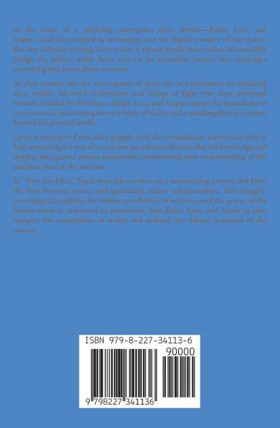 In the heart of a sprawling metropolis, three friends-Rylan, Lyra, and Vesper-lead lives steeped in technology and the digital wonders of the matrix. But one ordinary evening, their reality is turned upside down when otherworldly beings, the Alenas, whisk them away on an interstellar journey that challenges everything they know about existence. As they venture into the vast expanse of space, the trio encounters breathtaking alien worlds, advanced civilizations, and beings of light who share profound wisdom. Guided by the Alenas, Rylan, Lyra, and Vesper explore the boundaries of consciousness, questioning the very fabric of reality and expanding their perception beyond the physical world. Upon returning to Earth, they grapple with the extraordinary experiences they've had, wondering if it was all real or just an elaborate illusion. But the knowledge and insights they gained remain undeniable, transforming their understanding of life and their place in the universe. In "They Are Here," Yug Gohan takes readers on a mesmerizing journey that blurs the lines between science and spirituality, reality and perception. This thought-provoking tale explores the infinite possibilities of existence and the power of the human mind to transcend its limitations. Join Rylan, Lyra, and Vesper as they navigate the complexities of reality and embrace the infinite potential of the cosmos.