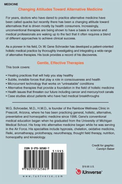 Changing Attitudes Toward Alternative Medicine For years, doctors who have dared to practice alternative medicine have been called quacks but recently there has been a changing attitude toward alternatives that is driven mostly by health consumers. Increasingly, unconventional therapies are being shown to have a basis in science and medical professionals are waking up to the fact that it often requires a blend of different approaches to achieve clinical success. a pioneer in his field, Dr. W. Gene Schroeder has developed a patient-oriented holistic medical practice by thoroughly investigating and integrating a wide-range of alternative therapies. His book provides a record of his discoveries. Gentle, Effective Therapies This book covers: Healing practices that will help you stay healthy Subtle, invisible forces that play a role in consciousness and health Microcurrent technology that works on "untreatable" conditions Alternative therapies that provide a foundation in the field of holistic medicine Health issues that threaten our future including cancer and mercury/root canals Case studies about patients who have had medical breakthroughs