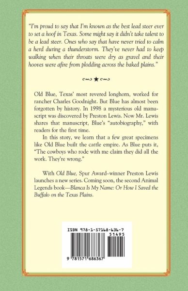 Old Blue, Texas' most revered longhorn, worked for rancher Charles Goodnight. But Blue has almost been forgotten by history. In 1998 a mysterious old manuscript was discovered by Preston Lewis. Now Mr. Lewis shares the manuscript, Blue's "autobiography," with readers for the first time. In this story, we learn that a few great specimens like Old Blue built the cattle empire. As Blue puts it, "The cowboys who rode with me claim they did all the work. They're wrong." With Old Blue, Spur Award-winner Preston Lewis launches a new series. Also available, the second Animal Legends book - "Blanca is My Name: Or How I Saved the Buffalo on the Texas Plains."…mehr