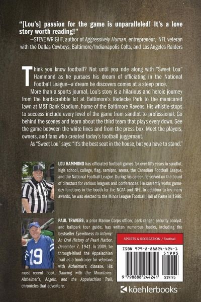 "His passion for the game is unparalleled! It's a love story worth reading!" -Steve Wright, author of Aggressively Human, entrepreneur, NFL veteran with the Dallas Cowboys, Baltimore/Indianapolis Colts, and Los Angeles Raiders "This book gives you the other angle of pro sports, the side of the officials who work their way up to the bigs to be loved or hated." -John Ziemann, Band President Baltimore Colts' Marching Band/Baltimore's Marching Ravens Think you know football? Not until you ride along with "Sweet Lou" Hammond as he pursues his dream of officiating in the National Football League-a dream he discovers comes at a steep price. More than a sports journal, Lou's story is a hilarious and heroic journey from the hardscrabble lot at Baltimore's Radecke Park to the manicured lawn at M&T Bank Stadium, home of the Baltimore Ravens. His whistle-stops to success include every level of the game from sandlot to professional. Go behind the scenes and learn about the third team that plays every down. See the game between the white lines and from the press box. Meet the players, owners, and fans who created today's football juggernaut. As "Sweet Lou" says: "It's the best seat in the house, but you have to stand."