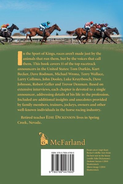 In the Sport of Kings, races aren't made just by the animals that run them, but by the voices that call them. This book covers 11 of the top racetrack announcers in the United States: Tom Durkin, Kurt Becker, Dave Rodman, Michael Wrona, Terry Wallace, Larry Collmus, John Dooley, Luke Kruytbosch, Dave Johnson, Robert Geller and Trevor Denman. Based on extensive interviews, each chapter is devoted to a single announcer, addressing details of his life in the profession. Included are additional insights and anecdotes provided by family members, trainers, jockeys, owners and other well-known individuals in the horse racing industry.