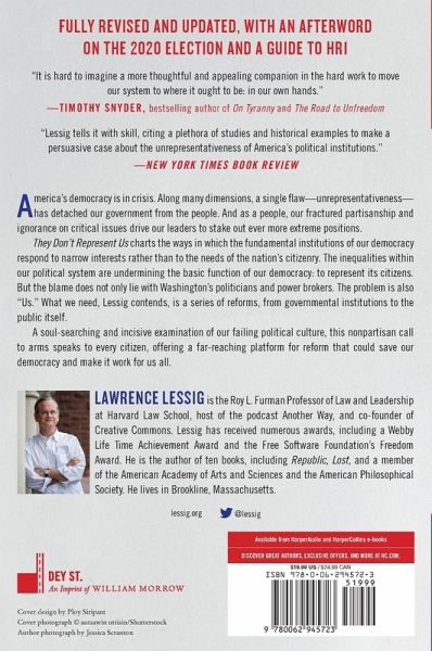 WITH A NEW AFTERWORD ABOUT THE 2020 ELECTION ?This urgent book offers not only a clear-eyed explanation of the forces that broke our politics, but a thoughtful and, yes, patriotic vision of how we create a government that's truly by and for the people.??DAVID DALEY, bestselling author of Ratf**ked and Unrigged In the vein of On Tyranny and How Democracies Die, the bestselling author of Republic, Lost argues with insight and urgency that our democracy no longer represents us and shows that reform is both necessary and possible. America's democracy is in crisis. Along many dimensions, a single flaw?unrepresentativeness?has detached our government from the people. And as a people, our fractured partisanship and ignorance on critical issues drive our leaders to stake out ever more extreme positions. In They Don't Represent Us, Harvard law professor Lawrence Lessig charts the way in which the fundamental institutions of our democracy, including our media, respond to narrow interests rather than to the needs and wishes of the nation's citizenry. But the blame does not only lie with ?them??Washington's politicians and power brokers, Lessig argues. The problem is also ?us.? ?We the people? are increasingly uninformed about the issues, while ubiquitous political polling exacerbates the problem, reflecting and normalizing our ignorance and feeding it back into the system as representative of our will. What we need, Lessig contends, is a series of reforms, from governmental institutions to the public itself, including: * A move immediately to public campaign funding, leading to more representative candidates * A reformed Electoral College, that gives the President a reason to represent America as a whole * A federal standard to end partisan gerrymandering in the states * A radically reformed Senate * A federal penalty on states that don't secure to their people an equal freedom to vote * Institutions that empower the people to speak in an informed and deliberative way A soul-searching and incisive examination of our failing political culture, this nonpartisan call to arms speaks to every citizen, offering a far-reaching platform for reform that could save our democracy and make it work for all of us.