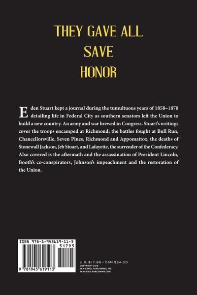 Eden Stuart kept a journal during the tumultuous years of 1858-1870 detailing life in Federal City as southern senators left the Union to build a new country. An army and war brewed in Congress. Stuart's writings cover the troops encamped at Richmond; the battles fought at Bull Run, Chancellorsville, Seven Pines, Richmond and Appomattox, the deaths of Stonewall Jackson, Jeb Stuart, and General Lafayette, the surrender of the Confederacy. Also covered is the aftermath and the assassination of President Lincoln, Booth's co-conspirators, Johnson's impeachment and the restoration of the Union.