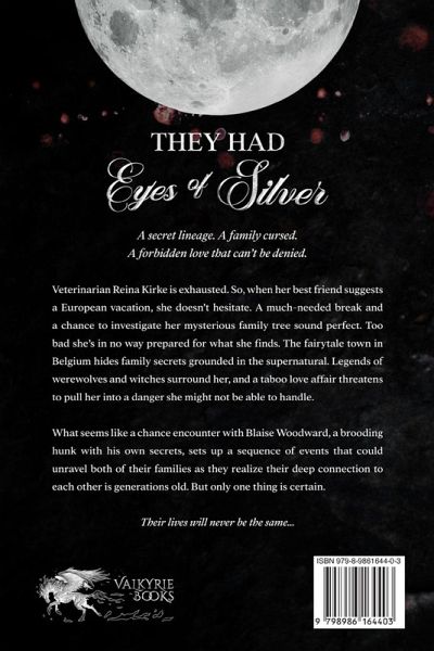 A secret lineage. A family cursed. A forbidden love that can't be denied. Veterinarian Reina Kirke is exhausted. So, when her best friend suggests a European vacation, she doesn't hesitate. A much-needed break and a chance to investigate her mysterious family tree sound perfect. Too bad she's in no way prepared for what she finds. The fairytale town in Belgium hides family secrets grounded in the supernatural. Legends of werewolves and witches surround her, and a taboo love affair threatens to pull her into a danger she might not be able to handle. What seems like a chance encounter with Blaise Woodward, a brooding hunk with his own secrets, sets up a sequence of events that could unravel both of their families as they realize their deep connection to each other is generations old. But only one thing is certain. Their lives will never be the same...