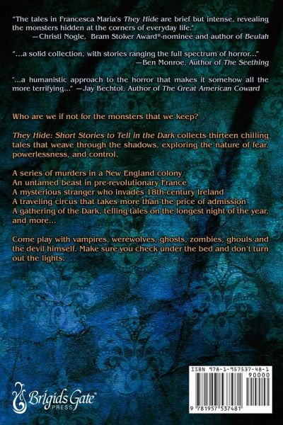 "The tales in Francesca Maria's They Hide are brief but intense, revealing the monsters hidden at the corners of everyday life. The author's lifelong love of horror shines through here. Make sure to check the warnings and read in the daylight lest you become too unnerved." -Christi Nogle, Bram Stoker Award®-nominee and author of Beulah "... a solid collection, with stories ranging the full spectrum of horror, from grim and grisly, to suspenseful, to dark humor, and one true heartbreaker. All your classic monster tropes are represented here, and all done really well. ...Whatever your taste in horror, I'm sure you'll find something in They Hide that you'll enjoy." -Ben Monroe, Author of The Seething "...a humanistic approach to the horror that makes it somehow all the more terrifying...That may be the key to her storytelling. The people and things that populate these tales are relatable, whether they be monsters or human or somewhere in between...If you like short stories that bring new perspectives to things you thought you already knew, you'll want to check this collection out."-Jay Bechtol, Author of The Great American Coward Who are we if not for the monsters that we keep? They Hide: Short Stories to Tell in the Dark collects thirteen chilling tales that weave through the shadows, exploring the nature of fear, powerlessness, and control. - A series of murders in a New England colony - An untamed beast in pre-revolutionary France - A mysterious stranger who invades 18th-century Ireland - A traveling circus that takes more than the price of admission - A gathering of the Dark, telling tales on the longest night of the year, and more. Come play with vampires, werewolves, ghosts, zombies, ghouls and the devil himself. Make sure you check under the bed and don't turn out the lights.