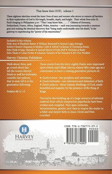 Is it possible to know God? Is He really knowable? And if He is, then can we actually come to know Him intimately, talking to Him as friend to friend, hearing His voice guiding and counseling us, living to please Him and basking in His company? From Biblical times up to the present, men and women have asked these questions and forged out answers that enabled them to become what we now describe as "the saints of the Church." The journey of some of these saints is recorded in They Knew Their God Volume One by E. & L. Harvey who were inspiredthe passage in Psalms 48: 12-13: "Walk about Zion, go all around it, count its towers, consider well its ramparts; go through its citadels, that you may tell the next generation." Beginning with Nicholas of Basle, a fourteenth century preacher, and concluding with Johanna Veenstra, a twentieth century missionary, the authors introduce us to men and women whose desire to know God, led them on often dangerous yet rewarding journeys. Their starting point varied greatly—Roman Catholic, Lutheran, Episcopalian, Salvation Army, and Methodist, but they all had a common goal-- a life hidden in the heart of God. Don’t read this book, however, if you are stuck within denominational boundaries. Don’t read it if you want a hard and fast recipe for spiritual success. Don’t read it if you have already set the limits of your faith. But read it if you feel within you the unquenchable desire to know the God Who made you, loved you, and redeemed you. And then be inspired to forge out your own peculiar journey into God.