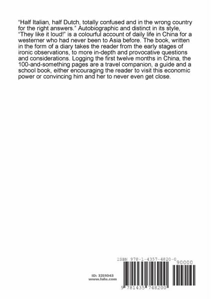 "Half Italian, half Dutch, totally confused and in the wrong country for the right answers." Autobiographic and distinct in its style, "They like it loud!" is a colourful account of daily life in China for a westerner who had never been to Asia before. The book, written in the form of a diary, takes the reader from the early stages of ironic observations, to more in-depth and provocative questions and considerations. Logging the first twelve months in China, the 100-and-something pages are a travel companion, a guide and a school book, either encouraging the reader to visit this economic power or convincing him and her to never even get close.