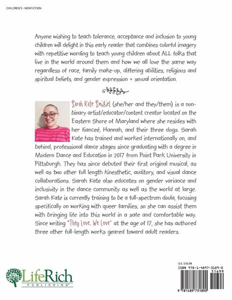 Sarah Kate Smigiel (she/her and they/them) is a non-binary artist/educator/content creator located on the Eastern Shore of Maryland where she resides with her fianceé, Hannah, and their three dogs. Sarah Kate has trained and worked internationally on, and behind, professional dance stages since graduating with a degree in Modern Dance and Education in 2017 from Point Park University in Pittsburgh. They has since debuted their first original musical, as well as two other full length kinesthetic, auditory, and visual dance collaborations. Sarah Kate also educates on gender variance and inclusivity in the dance community as well as the world at large. Sarah Kate is currently training to be a full-spectrum doula, focusing specifically on working with queer families, so she can assist them with bringing life into this world in a safe and comfortable way. Since writing "They Love, We Love" at the age of 17, she has authored three other full-length works geared toward adult readers.
