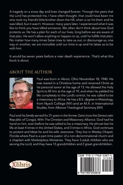 A tragedy on a snow day and lives changed forever. Through the years that the Lord has protected me, I have often thought, that could have been me who took my friend's little brother down the hill, when a car hit them and he was killed, but it wasn't. However, many years later, I experienced what it was like to think you have killed someone. We often don't think about how God protects us. He has a plan for each of our lives, long before we are aware of that plan. He won't allow anything to happen to us, until he fulfills that plan. No matter how many times Satan tries to take us out, or discourage us, one way or another, we are invincible until our time is up and he takes us to be with him. It would be seven years before a near death experience. That's what this book is about.