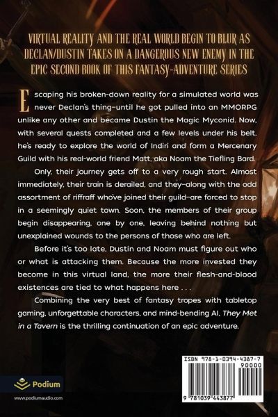 Virtual reality and the real world begin to blur as Declan/Dustin takes on a dangerous new enemy in the epic second book of this fantasy-adventure series. Escaping his broken-down reality for a simulated world was never Declan's thing-until he got pulled into an MMORPG unlike any other and became Dustin the Magic Myconid. Now, with several quests completed and a few levels under his belt, he's ready to explore the world of Indiri and form a Mercenary Guild with his real-world friend Matt, aka Noam the Tiefling Bard. Only, their journey gets off to a very rough start. Almost immediately, their train is derailed, and they-along with the odd assortment of riffraff who've joined their guild-are forced to stop in a seemingly quiet town. Soon, the members of their group begin disappearing, one by one, leaving behind nothing but unexplained wounds to the persons of those who are left. Before it's too late, Dustin and Noam must figure out who or what is attacking them. Because the more invested they become in this virtual land, the more their flesh-and-blood existences are tied to what happens here . . . Combining the very best of fantasy tropes with tabletop gaming, unforgettable characters, and mind-bending AI, They Met in a Tavern is the thrilling continuation of an epic adventure. The second volume of the hit LitRPG fantasy series-with more than 500,000 views on Royal Road-now available on Audible and wherever ebooks are sold!