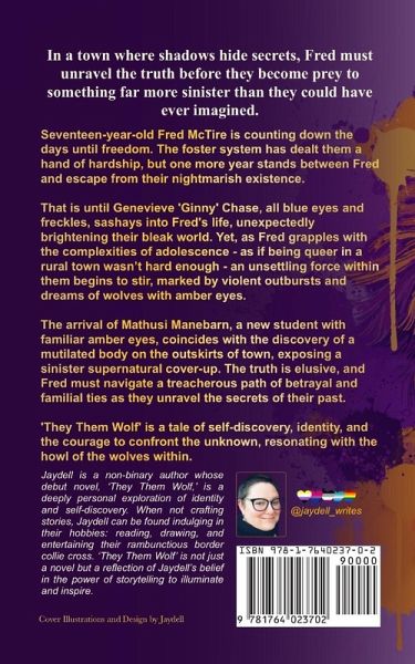 IN A TOWN WHERE SHADOWS HIDE SECRETS, FRED MUST UNCOVER THE TRUTH-BEFORE THEY BECOME THE NEXT HUNTED. Seventeen-year-old Winnifred "Fred" McTire is counting down the days until freedom. Life in the foster system has been a relentless struggle, but just one more year stands between them and escape. That is, until Genevieve "Ginny" Chase - all blue eyes and freckles - sashays into Fred's life, unexpectedly brightening their bleak world. Yet as Fred navigates the complexities of adolescence - as if being queer in a rural town wasn't hard enough - something unsettling begins to stir within them. Violent outbursts. Vivid dreams of wolves with amber eyes. A force they can't control. When Mathusi Manebarn, a mysterious new student with those same amber eyes, arrives in town, Fred's world tilts further off balance. Then, a mutilated body is discovered on the outskirts of town, exposing a sinister supernatural cover-up. The truth is elusive, and Fred must navigate a treacherous path of betrayal and familial ties to unravel the secrets of their past - before they lose themselves completely. A gripping LGBTQIA+ urban fantasy for readers 13+, They Them Wolf is a tale of self-discovery, identity, and the courage to confront the unknown - resonating with the howl of the wolves within.