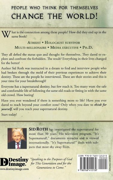 ¡Los que piensan por sí mismos transforman el mundo! ¿Cuál es la conexión entre estas personas? ¿Cómo terminaron en el mismo libro? Ateos* Sobrevivientes del Holocausto* Multimillonarios* Ejecutivos * Doctores Todos desafiaron el statu quo y pensaron por sí mismos. Se atrevieron a explorar y confrontar lo prohibido. ¿Cuál fue el resultado? ¡Todo en sus vidas cambió para bien! El autor Sid Roth recibió instrucciones en un sueño de entrevistar personas que se han salido de la norma para alcanzar su destino. Estas son las personas que entrevistó. Aquí encontrará sus historias. ¡A usted también le llegó el momento decisivo de avance! Todos tenemos un destino sobrenatural, pero pocos lo alcanzan. Demasiadas personas desean la vida cómoda y segura de seguir los mismos viejos caminos o de caer bien en los mismos grupos. ¡Qué aburrido! ¿Alguna vez se ha preguntado si hay algo más en la vida? ¿Se ha atrevido a ir más allá de su zona de confort? Sólo cuando se atreve a pensar por sí mismo, alcanzará su destino sobrenatural. ¡Comience hoy mismo!