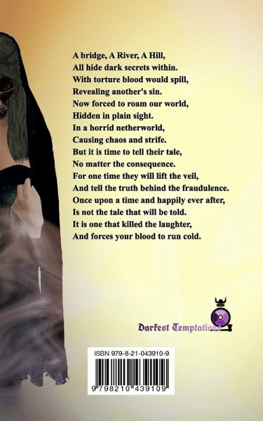 ***same amazing story but with a beautiful new look, also new bonus artwork inside**** Winner of the 2019 Canada Book Award A bridge, A River, A Hill, All hide dark secrets within. With torture blood would spill, Revealing another's sin. Now forced to roam our world, Hidden in plain sight. In a horrid netherworld, Causing chaos and strife. But it is time to tell their tale, No matter the consequence. For one time they will lift the veil, And tell the truth behind the fraudulence. Once upon a time and happily ever after, Is not the tale that will be told? It is one that killed the laughter, And forces your blood to run cold.