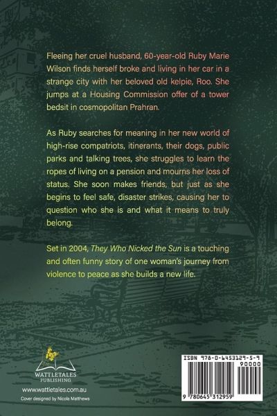 Fleeing her cruel husband, 60-year-old Ruby Marie Wilson finds herself broke and living in her car in a strange city with her beloved old Kelpie, Roo. She jumps at a Housing Commission offer of a tower bedsit in cosmopolitan Prahran. As Ruby searches for meaning in her new world of high-rise compatriots, itinerants, their dogs, public parks and talking trees, she struggles to learn the ropes of living on a pension and mourns her loss of status. She soon makes friends, but just as she begins to feel safe, disaster strikes, causing her to question who she is and what it means to truly belong. Set in 2004, They Who Nicked the Sun is a touching and often funny story of one woman's journey from violence to peace as she builds a new life.
