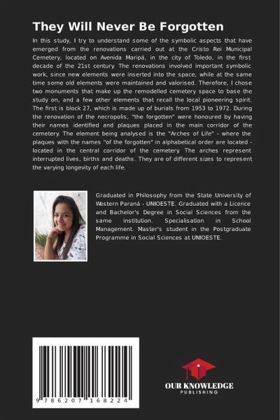 In this study, I try to understand some of the symbolic aspects that have emerged from the renovations carried out at the Cristo Rei Municipal Cemetery, located on Avenida Maripá, in the city of Toledo, in the first decade of the 21st century. The renovations involved important symbolic work, since new elements were inserted into the space, while at the same time some old elements were maintained and valorised. Therefore, I chose two monuments that make up the remodelled cemetery space to base the study on, and a few other elements that recall the local pioneering spirit. The first is block 27, which is made up of burials from 1953 to 1972. During the renovation of the necropolis, "the forgotten" were honoured by having their names identified and plaques placed in the main corridor of the cemetery. The element being analysed is the "Arches of Life" - where the plaques with the names "of the forgotten" in alphabetical order are located - located in the central corridor of the cemetery. The arches represent interrupted lives, births and deaths. They are of different sizes to represent the varying longevity of each life.