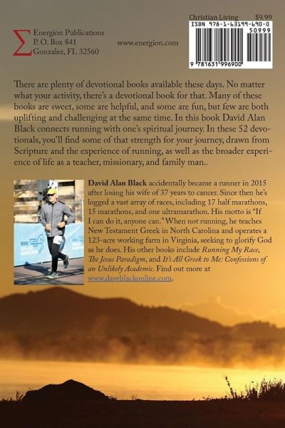 Are you a runner? Do you want to be? Are you running the race toward God’s high calling for you? This is the book for you. There are plenty of devotional books available these days. No matter what your activity, there’s a devotional book for that. Many of these books are sweet, some are helpful, and some are fun, but few are both uplifting and challenging at the same time. David Alan Black is a biblical scholar and serious theological thinker who also runs — on his own, 5k, half marathons, marathons, and ultramarathons. In this book he connects running with one’s spiritual journey. In these 52 devotionals, you’ll find some of that strength for your journey, drawn from scripture and the experience of running, as well as the broader experience of life as a teacher, missionary, and family man. Whether you are just looking out your front door and thinking, "I should get more exercise" or are an experienced runner, this book will help you reach your next goal.