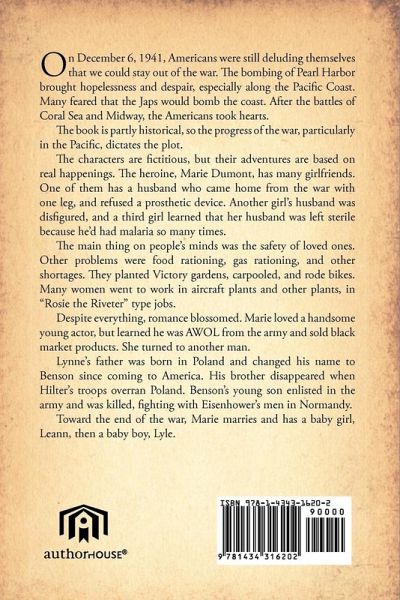 They Wore No Medals On December 6, 1921, Americans were still deluding themselves that we could stay out of the war. The bombing of Pearl Harbor brought hopelessness and despair, especially along the Pacific Coast. Many feared that the Japs would bomb the coast. After the battles of Coral Sea and Midway, the Americans took hearts. The book is partly historical, so the progress of the war, particularly in the Pacific, dictates the plot. The characters are fictitious, but their adventures are based on real happenings. The heroine, Marie Dumont, has many girlfriends. One of them has a husband who came home from the war with one leg, and refused a prosthetic device. Another girl's husband was disfigured, and a third girl learned that her husband was left sterile because he'd had malaria so many times. The main thing on people's minds was the safety of loved ones. Other problems were food rationing, gas rationing, and other shortages. They planted Victory gardens, carpooled, and rode bikes. Many women went to work in aircraft plants and other plants, in "Rosie the Riveter" type jobs. Despite everything, romance blossomed. Marie loved a handsome young actor, but learned he was AWOL from the army and sold black market products. She turned to another man. Lynne's father was born in Poland and changed his name to Benson since coming to America. His brother disappeared when Hilter's troops overran Poland. Benson's young son enlisted in the army and was killed, fighting with Eisenhower's men in Normandy. Toward the end of the war, Marie marries and has a baby girl, Leann, then a baby boy, Lyle.