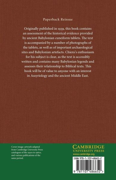 Originally published in 1939, this book contains an assessment of the historical evidence provided by ancient Babylonian cuneiform tablets. The text is accompanied by a number of photographs of the tablets, as well as of important archaeological sites and Babylonian artefacts. Chiera's enthusiasm for his subject is clear, as the text is accessibly written and contains many Babylonian legends and assesses their relationship to biblical texts. This book will be of value to anyone with an interest in Assyriology and the ancient Middle East.