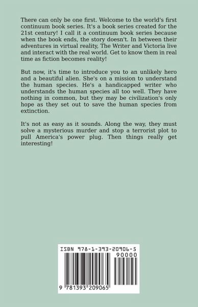 There can only be one first. Welcome to the world's first continuum book series. It's a book series created for the 21st century! I call it a continuum book series because when the book ends, the story doesn't. In between their adventures in virtual reality, The Writer and Victoria live and interact with the real world. Get to know them in real time as fiction becomes reality! But now, it's time to introduce you to an unlikely hero and a beautiful alien. She's on a mission to understand the human species. He's a handicapped writer who understands the human species all too well. They have nothing in common, but they may be civilization's only hope as they set out to save the human species from extinction. It's not as easy as it sounds. Along the way, they must solve a mysterious murder and stop a terrorist plot to pull America's power plug. Then things really get interesting!