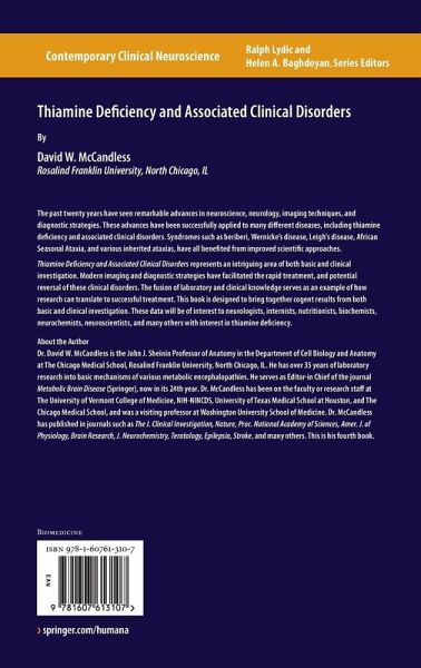 From the reviews: "This short 192 page book Thiamine Deficiency and Associated Clinical Disorders, which is part of the ongoing Contemporary Clinical Neuroscience series, is authored by David McCandless, Ph.D. who is known for his work in metabolic encephalopathy. For those who wish to have a deeper understanding of a number of metabolic derangements which result in neurological dysfunction, this book would be of interest. For the neuroradiologist there is an opportunity to view gross pathology and histopathology ... ." (American Journal of Neuroradiology, October, 2009)