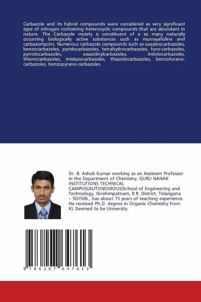 Carbazole and its hybrid compounds were considered as very significant type of nitrogen containing heterocyclic compounds that are abundant in nature. The Carbazole moiety is constituent of a so many naturally occurring biologically active substances such as murrayafoline and carbazomycins. Numerous carbazole compounds such as oxazinocarbazoles, benzocarbazoles, pyridocarbazoles, tetrahydrocarbazoles, furo-carbazoles, pyrrolocarbazoles, oxazolinylcarbazoles, indolocarbazoles, thionocarbazoles, imidazocarbazoles, thiazolocarbazoles, benzofurano-carbazoles, benzopyrano-carbazoles.