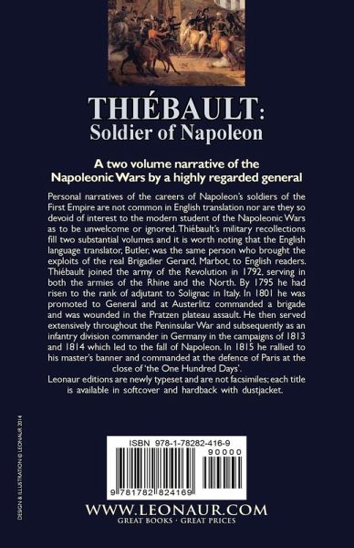 A two volume narrative of the Napoleonic Wars by a highly regarded general Personal narratives of the careers of Napoleon's soldiers of the First Empire are not common in English translation nor are they so devoid of interest to the modern student of the Napoleonic Wars as to be unwelcome or ignored. Thiébault's military recollections fill two substantial volumes and it is worth noting that the English language translator, Butler, was the same person who brought the exploits of the real Brigadier Gerard, Marbot, to English readers. Thiébault joined the army of the Revolution in 1792, serving in both the armies of the Rhine and the North. By 1795 he had risen to the rank of adjutant to Solignac in Italy. In 1801 he was promoted to General and at Austerlitz commanded a brigade and was wounded in the Pratzen plateau assault. He then served extensively throughout the Peninsular War and subsequently as an infantry division commander in Germany in the campaigns of 1813 and 1814 which led to the fall of Napoleon. In 1815 he rallied to his master's banner and commanded at the defence of Paris at the close of 'the One Hundred Days'. Leonaur editions are newly typeset and are not facsimiles; each title is available in softcover and hardback with dustjacket.