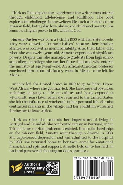Thick as Glue depicts the experiences the writer encountered through childhood, adolescence, and adulthood. The book explores the challenges in the writer's life, such as racism on the mission field, betrayal in love, abuse, and childhood poverty. She leans on a higher power in life, which is God. Annette Gaston was born a twin in 1955 with her sister, Annie. They were viewed as "miracle babies" because their brother, Mancie, was born with a mental disability. After their father died when she was twelve years old, Annette experienced significant poverty. Despite this, she managed to graduate from high school and college. In college, she met her future husband, who entered the ministry at age twenty-one. An African-American professor convinced him to do missionary work in Africa, so he left for Africa. Annette left the United States in 1979 to go to Sierra Leone, West Africa, where she got married. She faced several obstacles, including adapting to African culture and being exposed to witchcraft. Years later, when she returned to the United States, she felt the influence of witchcraft in her personal life. She also contracted malaria in the village, and her condition worsened, forcing her to leave Africa. Thick as Glue also recounts her impressions of living in Portugal and Trinidad. She confronted racism in Portugal, and in Trinidad, her marital problems escalated. Due to the hardships on the mission field, Annette went through a divorce in 1988. She experienced depression and was admitted to the hospital. In 1988, she returned home to her twin sister for emotional, financial, and spiritual support. Annette held on to her faith in God and persevered, focusing on God's promises.
