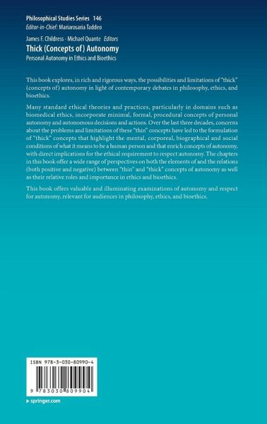 Many standard ethical theories and practices, particularly in domains such as biomedical ethics, incorporate minimal, formal, procedural concepts of personal autonomy and autonomous decisions and actions. Over the last three decades, concerns about the problems and limitations of these "thin" concepts have led to the formulation of "thick" concepts that highlight the mental, corporeal, biographical and social conditions of what it means to be a human person and that enrich concepts of autonomy, with direct implications for the ethical requirement to respect autonomy. The chapters in this book offer a wide range of perspectives on both the elements of and the relations (both positive and negative) between "thin" and "thick" concepts of autonomy as well as their relative roles and importance inethics and bioethics.