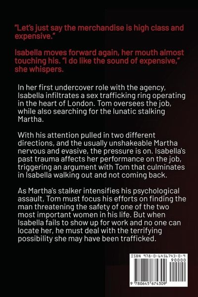 "Let's just say the merchandise is high class and expensive." Isabella moves forward again, her mouth almost touching his. "I do like the sound of expensive," she whispers. In her first undercover role with the agency, Isabella infiltrates a sex trafficking ring operating in the heart of London. Tom oversees the job, while also searching for the lunatic stalking Martha. With his attention pulled in two different directions, and the usually unshakeable Martha nervous and evasive, the pressure is on. Isabella's past trauma affects her performance on the job, triggering an argument with Tom that culminates in Isabella walking out and not coming back. As Martha's stalker intensifies his psychological assault, Tom must focus his efforts on finding the man threatening the safety of one of the two most important women in his life. But when Isabella fails to show up for work and no one can locate her, he must deal with the terrifying possibility she may have been trafficked.