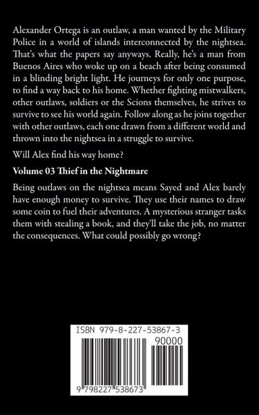 Alexander Ortega is an outlaw, a man wanted by the Military Police in a world of islands interconnected by the nightsea. That's what the papers say anyways. Really, he's a man from Buenos Aires who woke up on a beach after being consumed in a blinding bright light. He journeys for only one purpose, to find a way back to his home. Whether fighting mistwalkers, other outlaws, soldiers or the Scions themselves, he strives to survive to see his world again. Follow along as he joins together with other outlaws, each one drawn from a different world and thrown into the nightsea in a struggle to survive. Will Alex find his way home? Volume 03 Thief in the Nightmare Being outlaws on the nightsea means Sayed and Alex barely have enough money to survive. They use their names to draw some coin to fuel their adventures. A mysterious stranger tasks them with stealing a book, and they'll take the job, no matter the consequences. What could possibly go wrong?