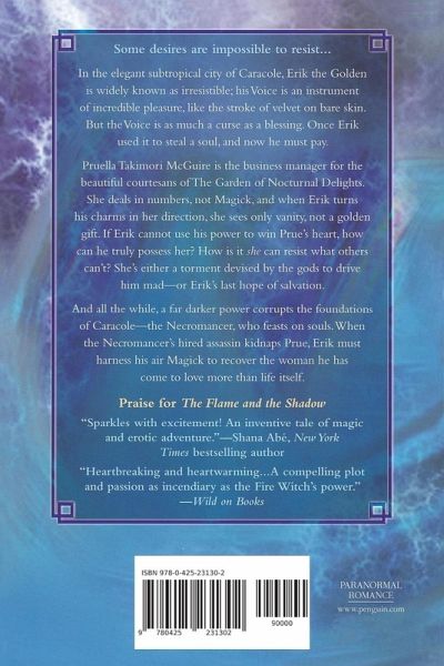 Some desires are impossible to resist...For fans of Laurel K. Hamilton and Shana Abé... In the elegant, subtropical city of Caracole, Erik the Golden is widely known as irresistible; his Voice an instrument of incredible pleasure, the stroke of velvet on bare skin. But the Voice is a curse as much as a blessing, for once Erik used it to steal a soul, and now he must pay. Pruella Takimori McGuire is the business manager for the beautiful courtesans of the Garden of Nocturnal Delights. She deals in numbers, not Magick, and when Erik turns his charms in her direction, she sees only vanity, not a golden gift. If Erik cannot use his power to win Prue’s heart, how can he truly possess her? How is it she can resist what others can’t? She’s either a torment devised by the gods to drive him mad or Erik’s last hope of salvation. And all the while, a far darker power corrupts the foundations of Caracole—the Necromancer, who feasts on souls. When the Necromancer’s hired assassin kidnaps Prue, Erik must harness his air Magick to recover the woman he has come to love more than life itself.