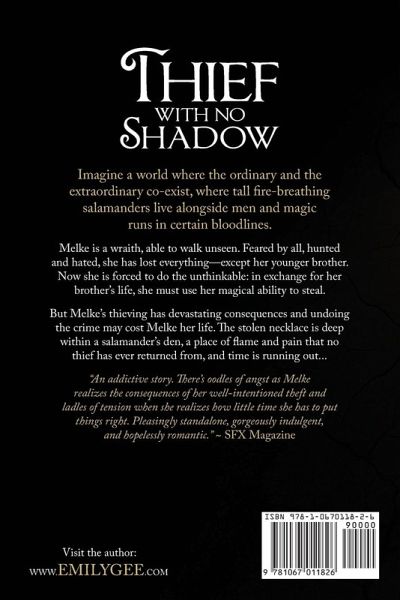 Imagine a world where the ordinary and the extraordinary co-exist, where tall fire-breathing salamanders live alongside men and magic runs in certain bloodlines. Melke is a wraith, able to walk unseen. Feared by all, hunted and hated, she has lost everything-except her younger brother. Now she is forced to do the unthinkable: in exchange for her brother's life, she must use her magical ability to steal. But Melke's thieving has devastating consequences and undoing the crime may cost Melke her life. The stolen necklace is deep within a salamander's den, a place of flame and pain that no thief has ever returned from, and time is running out...