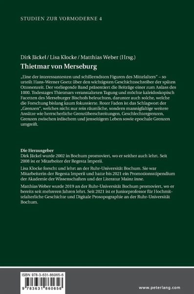 «Eine der interessantesten und schillerndsten Figuren des Mittelalters» - so urteilt Hans-Werner Goetz über den wichtigsten Geschichtsschreiber der späten Ottonenzeit. Der vorliegende Band präsentiert die Beiträge einer zum Anlass des 1000. Todestages Thietmars veranstalteten Tagung und möchte kaleidoskopisch Facetten des Merseburger Bischofs beleuchten, darunter auch solche, welche die Forschung bislang kaum fokussierte. Roter Faden ist das Schlagwort der «Grenzen», welches nicht nur rein räumliche, sondern mannigfaltige weitere Ansätze wie herrscherliche Grenzüberschreitungen, Geschlechtergrenzen, Grenzen zwischen irdischem und jenseitigem Leben sowie epochale Grenzen umgreift.