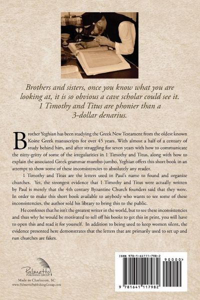 "Brothers and sisters, once you know what you are looking at, it is so obvious a cave scholar could see it. 1 Timothy and Titus are phonier than a 3-dollar denarius." Brother Yeghian has been studying the Greek New Testament from the oldest known Koine Greek manuscripts for over 45 years. With almost a half of a century of study behind him, and after struggling for seven years with how to communicate the nitty-gritty of some of the irregularities in 1 Timothy and Titus, along with how to explain the associated Greek grammar mumbo-jumbo, Yeghian offers this short book in an attempt to show some of these inconsistencies to absolutely any reader. 1 Timothy and Titus are the letters used in Paul's name to found and organize churches. Yet, the strongest evidence that 1 Timothy and Titus were actually written by Paul is merely that the 4th century Byzantine Church founders said that they were. In order to make this short book available to anybody who wants to see some of these inconsistencies, the author sold his library to bring this to the public. He confesses that he isn't the greatest writer in the world, but to see these inconsistencies and thus why he would be motivated to sell off his books to get this in print, you will have to open this and read it for yourself. In addition to being used to keep women silent, the evidence presented here demonstrates that the letters that are primarily used to set up and run churches are fakes.