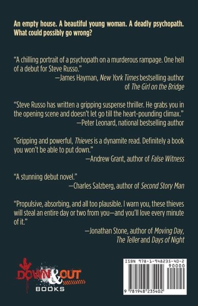 Esmeralda works for a housecleaning service during the day and as a restaurant hostess at night. Just out of high school, she is the sole support for her mother and two young siblings. She has drive and ambition. What she doesn’t have is money. She knows of a home in the upscale town of Mendham, NJ, that will be empty for more than a month. The rich people who live there go away the same time every year to spend time at their vacation home. Having cleaned the house, she also knows it contains a fair amount of cash and valuables. One night sitting with Ray, one of her co-workers, she casually mentions a "what if" scenario; Ray tells Skooley, a white trash drifter who recently moved to New Jersey from south Florida, and a plan is hatched. It isn’t long before Esmeralda finds herself trapped by both circumstance and greed, forced to try and defend herself against one of her partners in crime, who she quickly discovers is far more dangerous than she ever thought possible. Praise for THIEVES: "A chilling portrait of a psychopath on a murderous rampage. One hell of a debut for Steve Russo." —James Hayman, New York Times bestselling author of The Girl on the Bridge "Kudos to Steven Max Russo. I read Thieves in one sitting—it’s propulsive, absorbing, and all too plausible. I warn you, these thieves will steal an entire day or two from you—and you’ll love every minute of it." —Jonathan Stone, author of Moving Day, The Teller, and Days of Night "Gripping and powerful, Thieves is a dynamite read. Definitely a book you won’t be able to put down." —Andrew Grant, author of False Witness "With Thieves, Steven Max Russo works the rich tradition of American heist fiction like a pro." —Wallace Stroby, author of the Crissa Stone series "A stunning debut novel. Steve Russo hits it out of the park with an ingenious, diabolical plot, a unique voice, and complex characters that will stay with you long after you’ve turned the final page." —Charles Salzberg, author of Second Story Man and the Shamus Award-nominated Henry Swann mysteries "Steve Russo has written a gripping suspense thriller. He grabs you in the opening scene and doesn’t let go till the heart-pounding climax." —Peter Leonard, national bestselling author