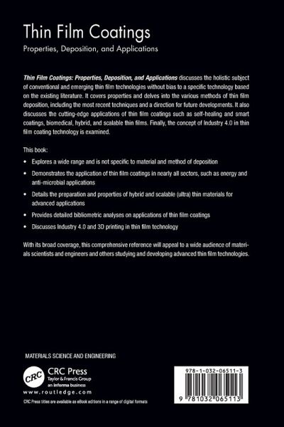 1. Introduction to Thin Films and Coatings. 2. Methods of Thin Film Deposition. 3. Characterization Techniques for Thin Films. 4. Hybrid and Scalable Thin Films. 5. Bibliometric Analysis of Applications of Thin Film Coatings. 6. Thin Films for Biomedical Applications. 7. Thin Films for Surface Protection. 8. Thin Films for Cutting Tools. 9. Thin Films for Electronic, Spintronica, and Optical Applications. 10. Thin Films for Energy Applications. 11. Smart and Self-Healing Thin Film Materials. 12. Thin Films for Antimicrobial Applications. 13. High Entropy Alloy Thin Films. 14. Thin Films and Industry 4.0. 15. Thin Films and 3D Printing Technology
