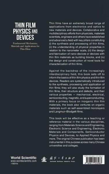 Thin films have an extremely broad range of applications from electronics and optics to new materials and devices. Collaborative and multidisciplinary efforts from physicists, materials scientists, engineers and others have established and advanced a field with key pillars constituting (i) the synthesis and processing of thin films, (ii) the understanding of physical properties in relation to the nanometer scale, (iii) the design and fabrication of nano-devices or devices with thin film materials as building blocks, and (iv) the design and construction of novel tools for characterization of thin films. Against the backdrop of the increasingly interdisciplinary field, this book sets off to inform the basics of thin film physics and thin film devices. Readers are systematically introduced to the synthesis, processing and application of thin films; they will also study the formation of thin films, their structure and defects, and their various properties - mechanical, electrical, semiconducting, magnetic, and superconducting. With a primary focus on inorganic thin film materials, the book also ventures on organic materials such as self-assembled monolayers and Langmuir-Blodgett films. This book will be effective as a teaching or reference material in the various disciplines, ranging from Materials Science and Engineering, Electronic Science and Engineering, Electronic Materials and Components, Semiconductor Physics and Devices, to Applied Physics and more. The original Chinese publication has been instrumental in this purpose across many Chinese universities and colleges.