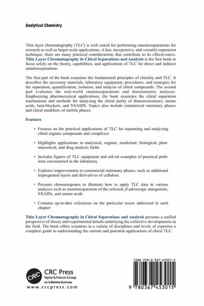 The first part of the book examines the fundamental principles of chirality and TLC. It describes the necessary materials, laboratory equipment, procedures, and strategies for the separation, quantification, isolation, and analysis of chiral compounds. The second part evaluates the real-world enantioseparations and densitometric analyses. Emphasizing pharmaceutical applications, the book discusses chiral separation mechanisms and methods for analyzing the chiral purity of diastereoisomers, amino acids, beta-blockers, and NSAIDS. Topics also include commercial stationary phases and chiral modifiers of mobile phases.