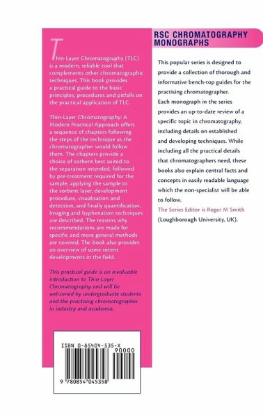 Thin-Layer Chromatography (TLC) is a modern, reliable tool that complements other chromatographic techniques. This book provides a practical guide to the basic principles, procedures, and pitfalls on the practical application of TLC. Thin Layer Chromatography: A Modern Practical Approach offers a sequence of chapters following the steps of the technique as the chromatographer would follow them. The chapters provide a choice of sorbent best suited to the separation intended, followed by pre-treatment required for the sample, applying the sample to the sorbent layer, development procedure, visualisation and detection, and finally quantification. Imaging and hyphenation techniques are described. The reasons why recommendations are made for specific and more general methods are covered. The book also provides an overview of some recent developments in the field. This practical guide is an invaluable introduction to Thin-Layer Chromatography, and will be welcomed by undergraduate students and the practising chromatographer in industry and academia. TOC:Introduction and History.- Sorbents and Bonded Layers.- Sample Pre-treatment.- Sample Application.- Development Techniques; Detection and Visualization.- Quantification and Video Imaging.- TLC Coupling Techniques.- Subject Index.