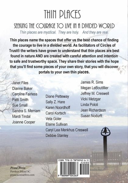 THIN PLACES Seeking the Courage to Live in a Divided World Places are mystical. They are holy. And they are real. Thin places name the spaces that offer us the best chance of finding the courage to live in a divided world. As facilitators of Circles of Trust® the writers have grown to understand that thin places are best found in nature AND are created with careful attention and intention to safe and trustworthy space. They share their stories with the hope that you’ll find some pieces of your own story, that you will discover portals to your own thin places: Janet Files, Dianne Baker, Caroline Fairless, Patti Smith, Sue E. Small,Sandra Sturdivant Merriam, Mardi Tindal, Joanne Cooper, Diane Petteway,Sally Z. Hare, Karen Noordhoff, Carol Kortsch, Veta Goler, Elaine Sullivan,Caryl Lea Menkhus Creswell, Debbie Stanley, James R. Sims, Megan LeBoutillier, Jeffrey M. Creswell, Vicki Metzgar, Linda Pololi, Jean Richardson, Susan Nodurft Insight from Parker J. Palmer