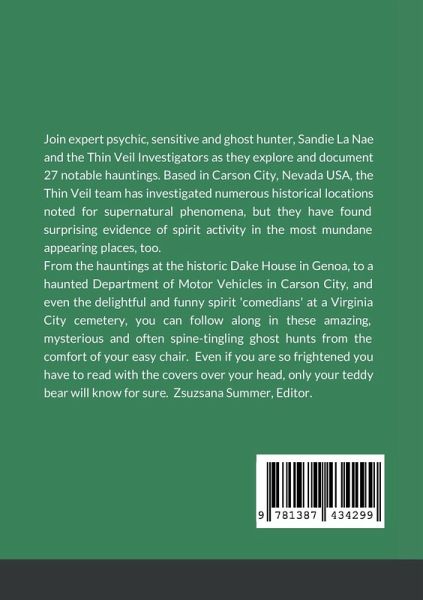 Join expert psychic, sensitive and ghost hunter, Sandie La Nae and the Thin Veil Investigators as they explore and document 27 notable hauntings. Based in Carson City, Nevada USA, the Thin Veil team has investigated numerous historical locations noted for supernatural phenomena, but they have found surprising evidence of spirit activity in the most mundane appearing places, too. From the hauntings at the historic Dake House in Genoa, to a haunted Department of Motor Vehicles in Carson City, and even the delightful and funny spirit 'comedians' at a Virginia City cemetery, you can follow along in these amazing, mysterious and often spine-tingling ghost hunts from the comfort of your easy chair. Even if you are so frightened you have to read with the covers over your head, only your teddy bear will know for sure. Zsuzsana Summer, Editor.