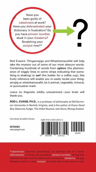Have you been guilty of catachresis* at work? Have you defenestrated* your dictionary in frustration? Do you have phloem bundles* stuck in your diastema*? Scratching your occiput* now? Rod L. Evans's Thingamajigs and Whatchamacallits will help take the mystery out of some of our most obscure words. Containing hundreds of words from agitron (the phenomenon of wiggly lines in comic strips indicating that something is shaking) to zarf (the holder for a paper cone coffee cup), this lively reference will enable you to easily locate your thingamajig or whatchamacallit, be it animal, vegetable, mineral, or punctuation mark. Leave no linguistic oddity unexamined-your brain will thank you. *catachresis: strained, paradoxical, or incorrect use of a word; *defenestrate: to throw out a window; *phloem bundles: stringy bits between the skin and the edible parts of a banana; *diastema: the gap between teeth in a jaw; *occiput: the back part of the head or skull