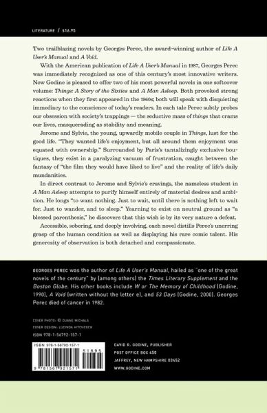 Two thematically-related novellas by Georges Perec in one volume. In each, Perec probes our obsession with society's trappings-the seductive mass of things that masquerade as stability and meaning. In Things: A Story of the Sixties, Jerome and Sylvie, a young, upwardly mobile couple lust for the good life, caught between the fantasy of "the film they would have liked to live" and the reality of life's daily mundanities. The nameless student in A Man Asleep attempts to purify himself entirely of material desires and ambition. He longs "to want nothing. Just to wait, until there is nothing left to wait for. Just to wander, and to sleep." Yearning to exist on neutral ground as "a blessed parenthesis," he discovers something unexpected. With the American publication of Life: A User's Manual in 1987, Georges Perec was recognized in the United States as one of this century's most innovative writers. Things: A Story of the Sixties is accessible, sobering, and deeply involving. Each novel distills Perec's unerring grasp of the human condition and displays his rare comic talent, detachment, and compassion.