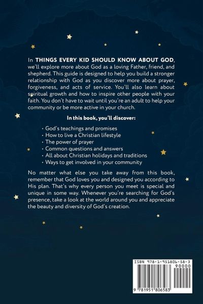 In THINGS KIDS SHOULD KNOW ABOUT GOD, we'll explore more about God as a loving Father, friend, and shepherd. This guide is designed to help you build a stronger relationship with God as you discover more about prayer, forgiveness, and acts of service. You'll also learn about spiritual growth and how to inspire other people with your faith. You don't have to wait until you're an adult to help your community or be more active in your church. In this book, you'll discover:God's teachings and promises How to live a Christian lifestyle The power of prayer Common questions and answers All about Christian holidays and traditions Ways to get involved in your community No matter what else you take away from this book, remember that God loves you and designed you according to His plan. That's why every person you meet is special and unique in some way. Whenever you're searching for God's presence, take a look at the world around you and appreciate the beauty and diversity of God's creation.
