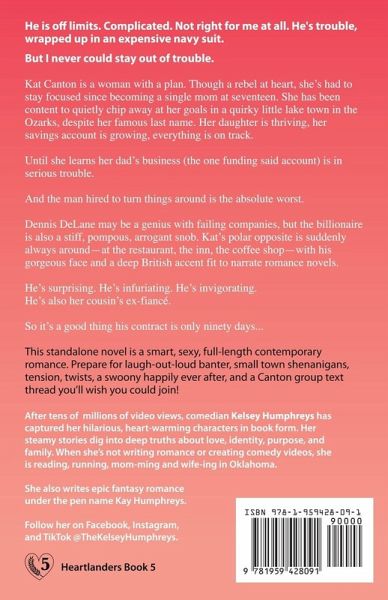 He is off limits. Complicated. Not right for me at all. He's trouble, wrapped up in an expensive navy suit. But I never could stay out of trouble... Kat Canton is a woman with a plan. Though a rebel at heart, she's had to stay focused since becoming a single mom at seventeen. She has been content to quietly chip away at her goals in a quirky little lake town in the Ozarks, despite her famous last name. Her daughter is thriving, her savings account is growing, everything is on track. Until she learns her dad's business (the one funding said account) is in serious trouble. And the man hired to turn things around is the absolute worst.Dennis DeLane may be a genius with failing companies, but the billionaire is also a stiff, pompous, arrogant snob. Kat's polar opposite, suddenly always around-at the restaurant, the inn, the coffee shop-with his gorgeous face and a deep British accent fit to narrate romance novels. He's surprising. He's infuriating. He's invigorating. He's also her cousin's ex-fiancé. So it's a good thing his contract only lasts ninety days... This standalone novel is a smart, sexy, full-length contemporary romance. Prepare for laugh-out-loud banter, small town shenanigans, tension, twists, a swoony happily ever after, and a Canton group text thread you'll wish you could join!