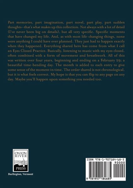 Part memories, part imagination, part novel, part play, part sudden thoughts-that's what makes up this collection. Not always with a lot of detail (I've never been big on details), but all very specific. Specific moments that have changed my life. And, as with most life-changing things, none were anything I could have ever planned. They just had to happen exactly when they happened. Everything shared here has come from what I call an Eyes Closed Practice. Basically, listening to music with my eyes closed, often combined with a form of movement and breathwork. All of this was written over four years, beginning and ending on a February 29; a beautiful time-bending day. The month is added to each entry to give some sense of the moment in time. The order shared is not chronological, but it is what feels correct. My hope is that you can flip to any page on any day. Maybe you'll happen upon something you needed too.