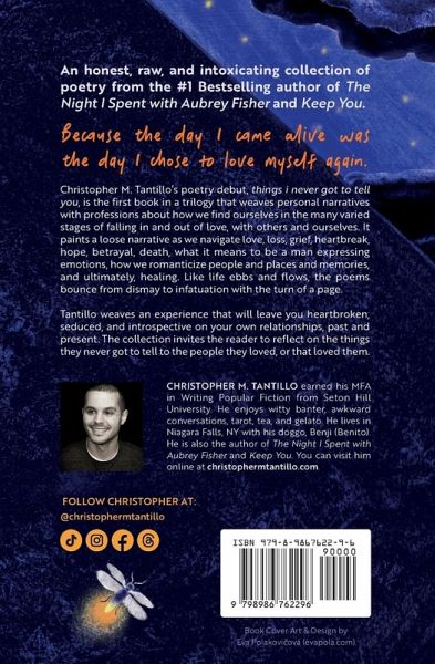 Christopher M. Tantillo earned his MFA in Writing Popular Fiction from Seton Hill University and his BA in Creative Writing from SUNY Oswego. He enjoys witty banter, awkward conversations, tarot, tea, and has an unhealthy obsession with gelato. You can find him, and his doggo Benji (Benito), on their own adventures in Niagara Falls, New York, where he grew up. He hopes to spread mental health awareness and advocacy with his writing. He has published essays in The Weaving Knight, The Great Lakes Review, and Twenty-two Twenty-eight. things i never got to tell you is his poetry debut. He is also the author of The Night I Spent with Aubrey Fisher and Keep You. You can find him online, and bring him a gelato, at christophermtantillo.com.