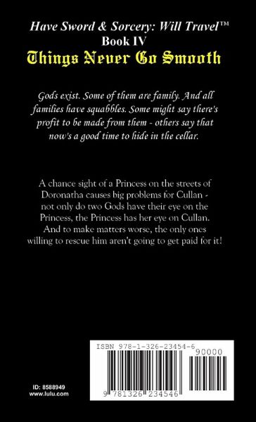 Gods exist. Some of them are family. And all families have squabbles. Some might say there's profit to be made from them - others say that now's a good time to hide in the cellar. A chance sight of a Princess on the streets of Doronatha causes big problems for Cullan - not only do two Gods have their eye on the Princess, the Princess has her eye on Cullan. And to make matters worse, the only ones willing to rescue him aren't going to get paid for it!