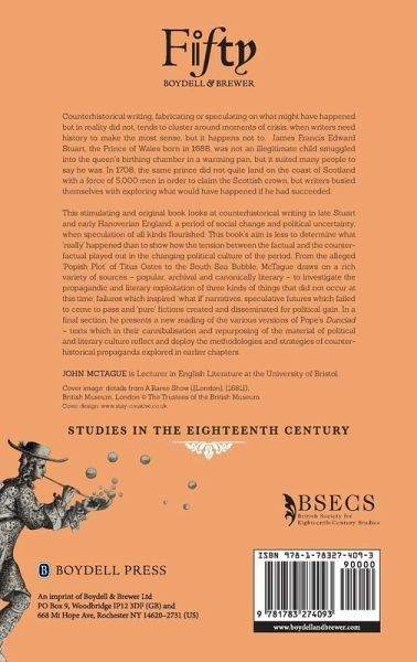 James Francis Edward Stuart, the Prince of Wales born in 1688, was not a commoner's child smuggled into the queen's birthing chamber in a warming pan, but many people said he was. In 1708, the same prince did not quite land in Scotland with a force of 5,000 men in order to claim the Scottish crown, but writers busied themselves with exploring what would have happened if he had succeeded. These fictions had as potent an effect on the political culture of late Stuart and early Hanoverian Britain as many events that really did happen. From the alleged "Popish Plot" of Titus Oates to the South Sea Bubble, John McTague draws on a rich variety of sources - popular, archival and literary - to investigate the propagandic and literary exploitation of three kinds of things that did not occur at this time: failures which inspired "what if" narratives, speculative futures which failed to come to pass and "pure" fictions created and disseminated for political gain. Finally, a ground-breaking reading of the various versions of Pope's Dunciad reveals a work that in its exploration of historic causation and agency and its repurposing of the material of contemporary political and literary culture deploys many of the strategies explored in earlier chapters to present Hanoverian reality as if it were counterhistory. JOHN MCTAGUE is Lecturer in English Literature at Bristol University.