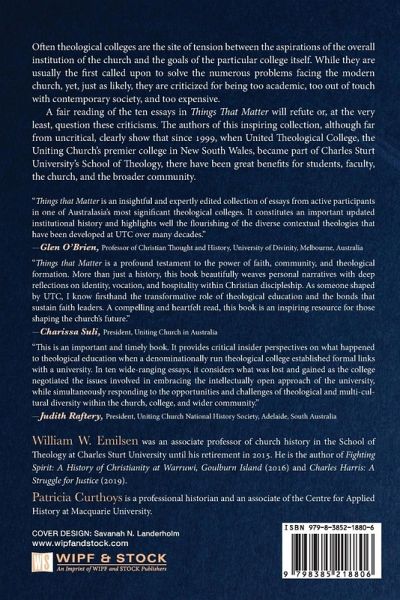 Often theological colleges are the site of tension between the aspirations of the overall institution of the church and the goals of the particular college itself. While they are usually the first called upon to solve the numerous problems facing the modern church, yet, just as likely, they are criticized for being too academic, too out of touch with contemporary society, and too expensive. A fair reading of the ten essays in Things That Matter will refute or, at the very least, question these criticisms. The authors of this inspiring collection, although far from uncritical, clearly show that since 1999, when United Theological College, the Uniting Church’s premier college in New South Wales, became part of Charles Sturt University’s School of Theology, there have been great benefits for students, faculty, the church, and the broader community.